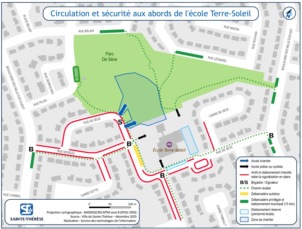 L’entrée du chantier — qui se situera au nord-ouest de l’école actuelle sur la rue De Sève — demeurera sécurisée lorsqu’il n’y aura pas d’entrée ou de sortie de véhicules. Un signaleur sera en poste pour contrôler la circulation à cette entrée lorsqu’elle sera utilisée par des véhicules lourds (ou poids lourds). Il y aura peu ou pas de transit de camionnage ou d’équipements lors des heures de circulation des autobus scolaires.